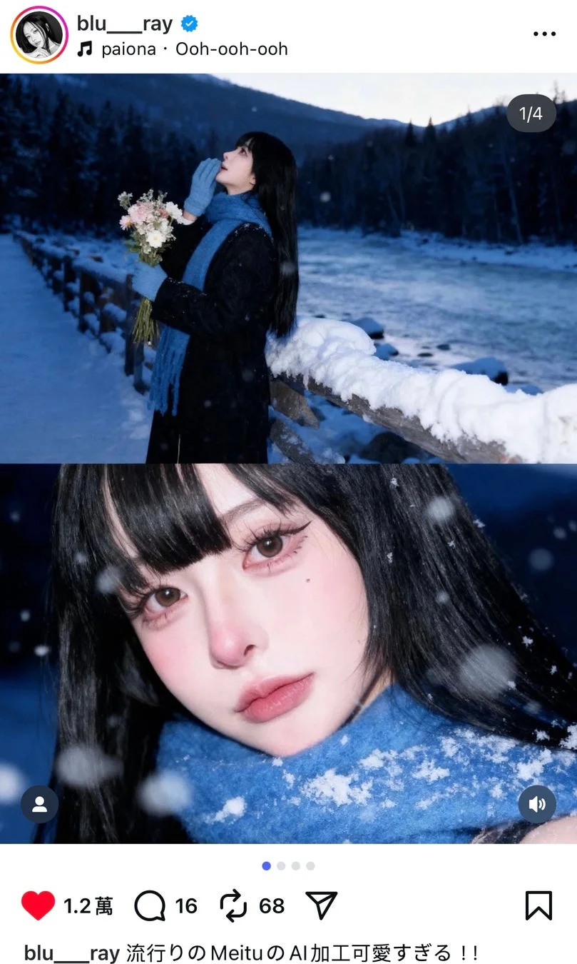 X(旧Twitter)やInstagramでは、「#雪加工」や「#Meitu」といったハッシュタグで検索すると、Z世代を中心に多くの投稿が見られます。AIを使って作られた画像は、現実ではなかなか撮れないような「理想の一瞬」を切り取る、新しいセルフポートレートとして楽しまれています。韓国のアイドルを中心に人気が広がり、日本でも冬に向けてトレンドになることが予想されます。