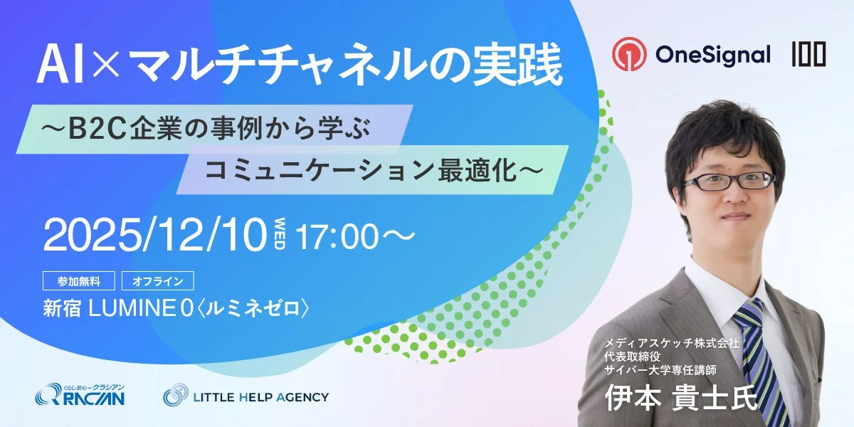 株式会社100とOneSignalは、AI(人工知能)と複数の顧客接点(マルチチャネル)を効果的に活用し、顧客とのコミュニケーションを最適化するためのイベント「AI×マルチチャネルの実践〜B2C企業の事例から学ぶコミュニケーション最適化〜」を2025年12月10日(水)に開催します。このイベントでは、JTBやクラシアンといった大手企業の具体的な事例を通じて、AI時代に求められる新しいコミュニケーションのあり方を学ぶことができます。