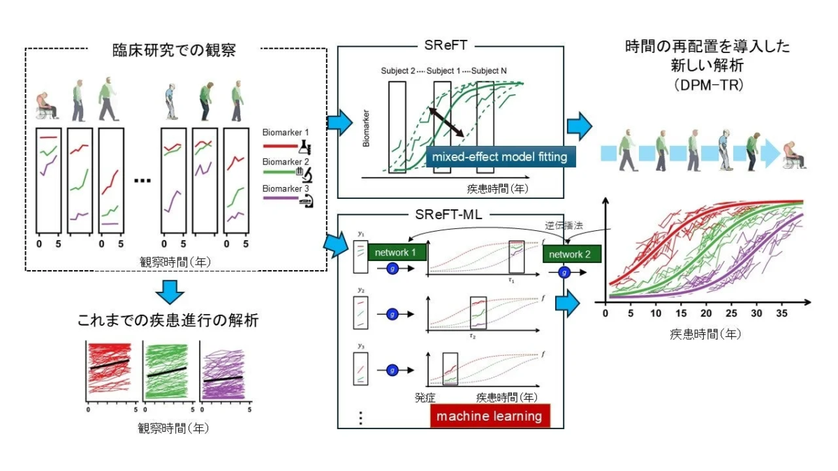 SReFT(エスレフト): 病気の進行における共通の軸を見つけ出し、複雑な統計モデルを使って、病気が始まってからの時間(疾患時間)とバイオマーカーや症状の変化を並べ替えて分析する手法です。