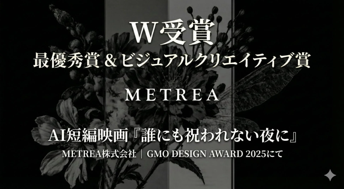 METREA株式会社は、AI(人工知能)技術とクリエイターの感性を組み合わせた短編映画『誰にも祝われない夜に』が、「GMO DESIGN AWARD 2025」にて、最も優れた作品に贈られる「最優秀賞」と、映像の美しさを評価する「ビジュアルクリエイティブ賞」をダブルで受賞したことを発表しました。この受賞は、AIが単なる道具ではなく、人の心を揺さぶるアート作品を生み出す可能性を示しています。