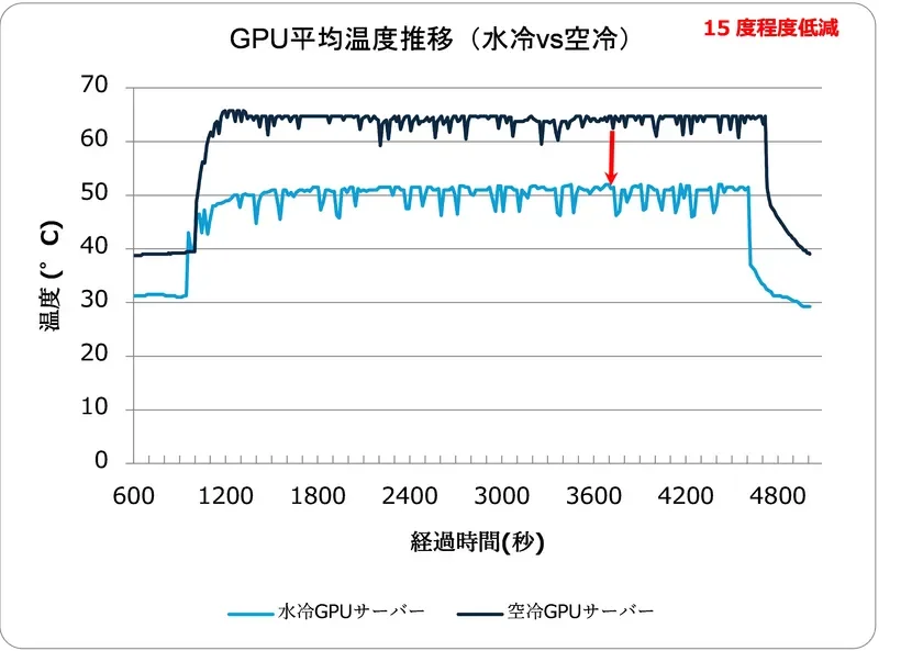 水冷GPUサーバーは、空冷GPUサーバーと比べて、最も負荷がかかった時のGPUの平均温度を約15度も下げることができました。これは、冷却装置がきちんと働いている証拠です。