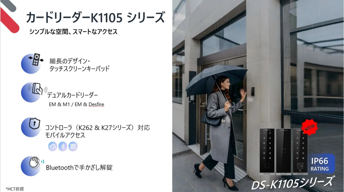 また、すでに日本で広く使われている顔認証デバイス「K1T673シリーズ」や「K1T342シリーズ」も、HIKVISIONの「HCT」というシステムと組み合わせることで、さまざまな認証機能が使えるようになります。
