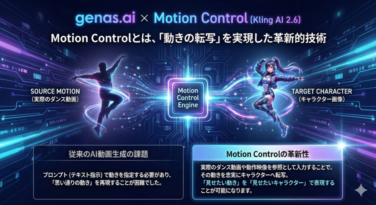 AI動画生成プラットフォーム「genas.ai(ジェナス)」に、中国Kuaishou(快手)が開発したKling AIの最新機能「Motion Control(モーション転写)」が、日本市場向けに実装され、提供が開始されました。