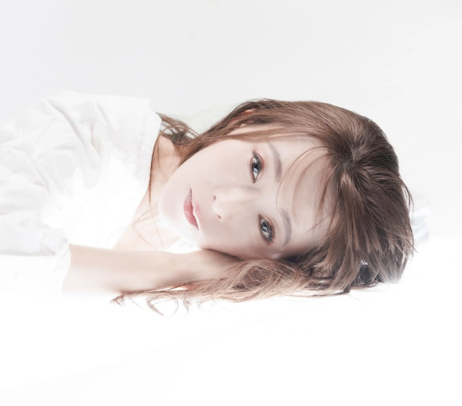 白い背景で、白いシャツを着た女性が横たわり、カメラを見つめているポートレート写真。透明感のある表情と柔らかな髪が印象的です。