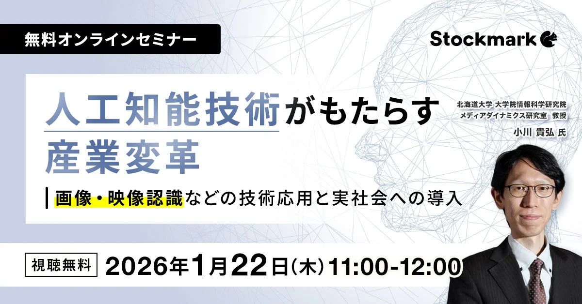 ストックマーク株式会社は、2026年1月22日(木)に無料オンラインセミナー「人工知能技術がもたらす産業変革 ― 画像・映像認識などの技術応用と実社会への導入」を開催します。このセミナーでは、人工知能が私たちの社会や産業をどのように変えていくのか、特に「画像・映像認識」という技術に焦点を当てて解説されます。