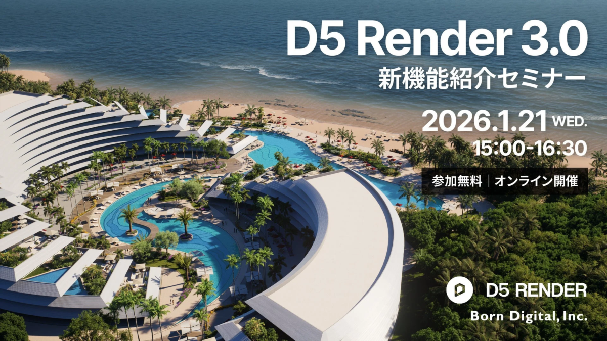 株式会社ボーンデジタルは、建物のデザインをまるで写真のようにリアルに見せる「リアルタイムレンダラー」というソフトウェア「D5 Render」の最新バージョン3.0について、無料のオンラインセミナーを開催します。