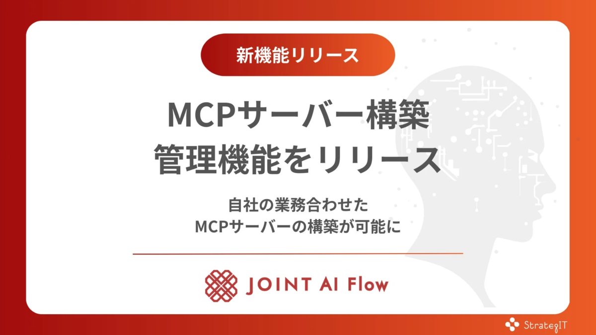株式会社ストラテジットは、AI活用プラットフォーム「JOINT AI Flow」に、企業独自のMCP(Model Context Protocol)サーバーを構築・管理できる新機能をリリースしました。この機能により、企業は自社の業務システムと生成AIを安全かつ柔軟に連携させ、「専用AIアシスタント」を開発・運用することが可能になります。