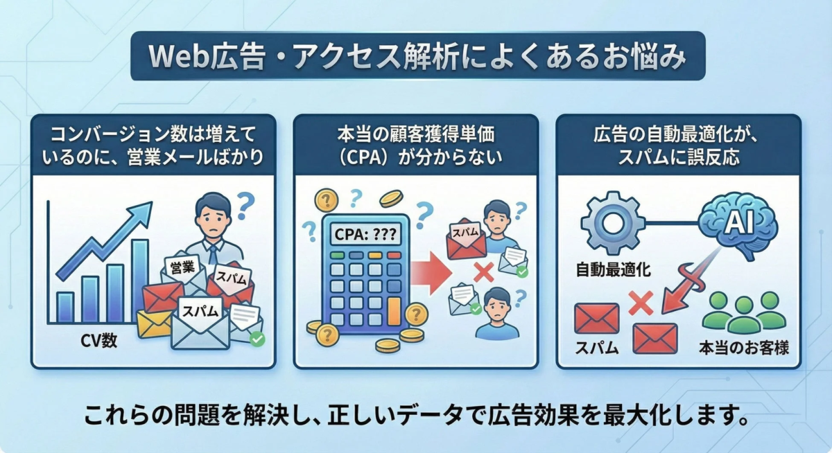 コンバージョン数が増えても、実際には営業メールばかりで「本当のお客様」からの問い合わせが少ない。