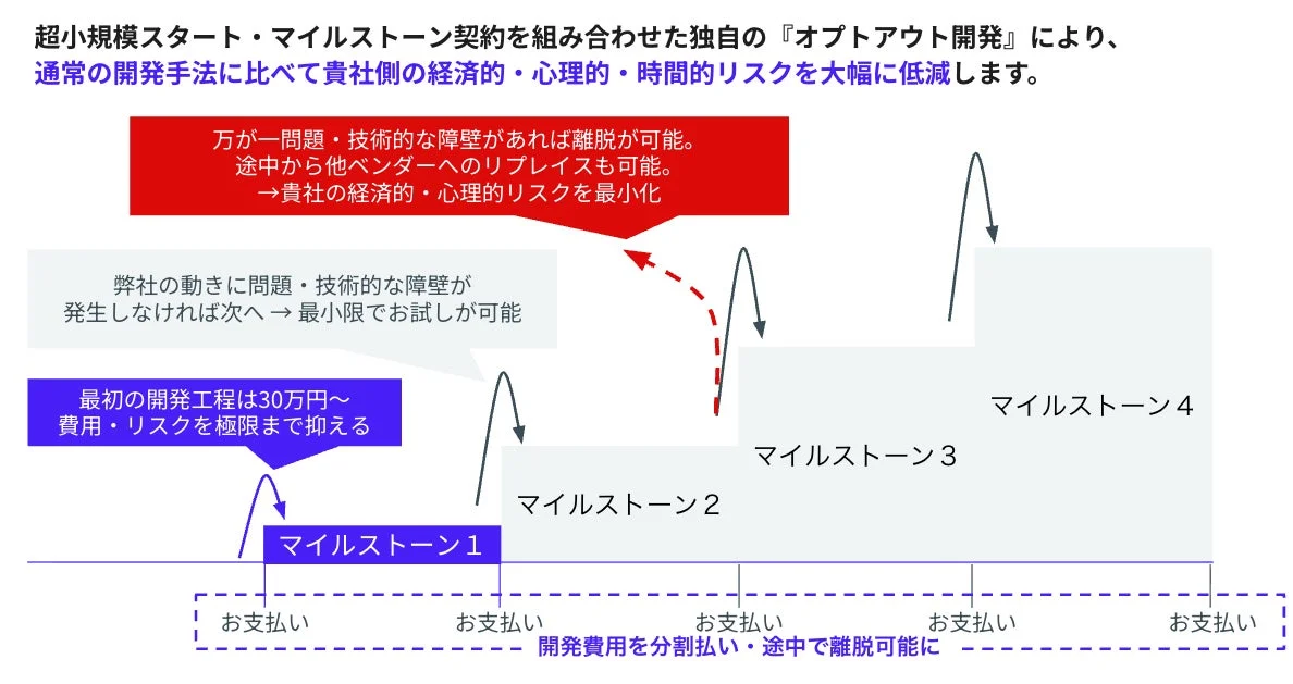 - マイルストーン型契約:プロジェクトをいくつかの段階(マイルストーン)に分けて契約します。もし途中で技術的な問題が起きたり、期待していた成果が得られないと感じたりした場合は、その段階でプロジェクトを中断したり、別の開発会社に引き継いだりすることが可能です。これにより、「一度始めたら後戻りできない」という心配がなくなります。
