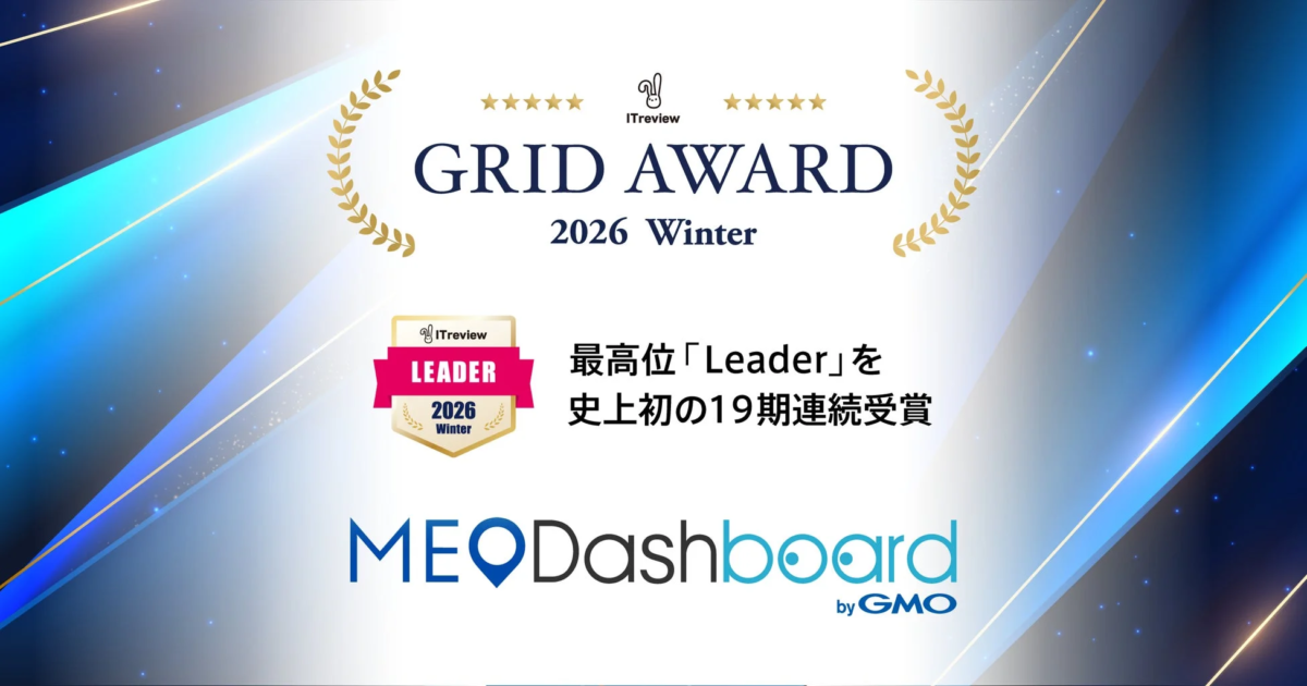 GMOインターネットグループのGMO TECHが提供するMEO総合管理ツール『MEO Dashboard byGMO』が、このたび「ITreview Grid Award 2026 Winter」において、MEO部門で最高位である「Leader」賞を19期連続で受賞しました。これは史上初の快挙となります。また、SNS管理部門でも13度目の「Leader」賞を受賞しています。