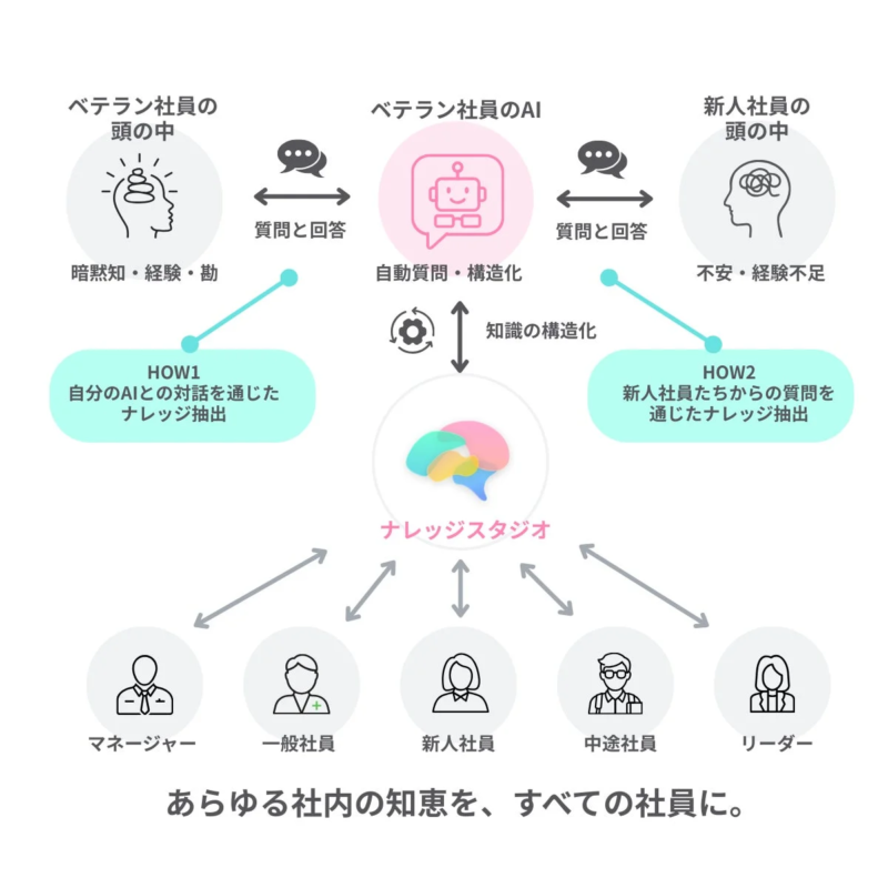 日々の業務で交わされる「質問と回答」そのものを起点として、社員の経験や判断をAIが学習し、次の人へと引き継いでいきます。AIが一方的に答えを返すだけでなく、経験者の判断や考え方を学びます。もしAIが答えられない質問があれば、AIを通じて経験者に確認し、そのやり取り自体が新しい知識としてどんどん蓄積されていく仕組みです。