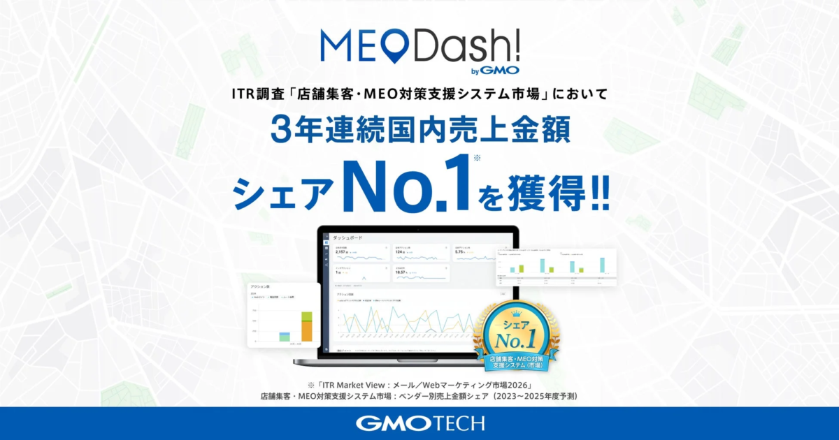 GMOインターネットグループのGMO TECH株式会社が提供するMEO店舗DX管理サービス「MEO Dash! byGMO」が、ITRの調査「ITR Market View:メール/Webマーケティング市場2026」において、2023年度の実績から2025年度の予測まで、3年連続で国内売上金額シェアNo.1を獲得しました。