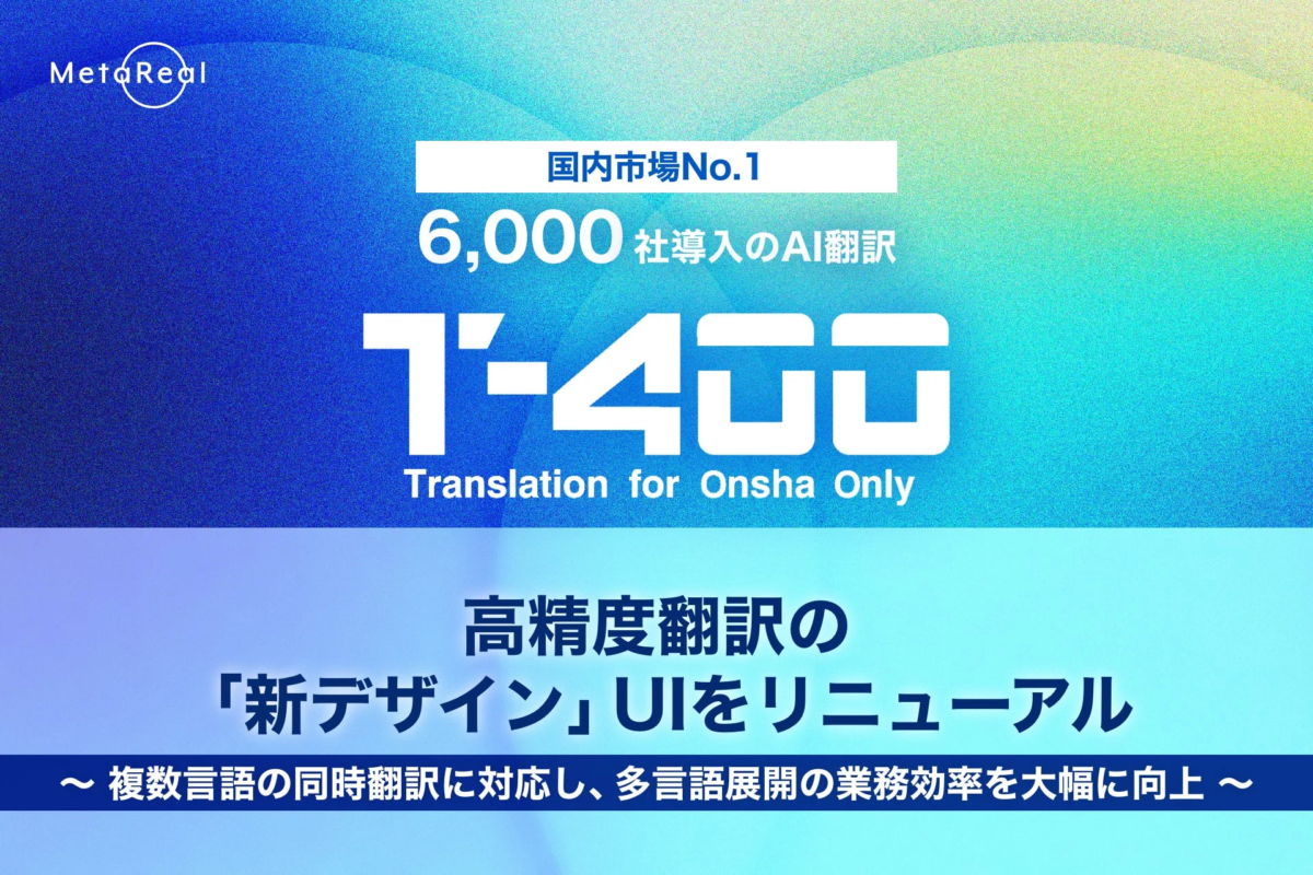 株式会社メタリアルグループの株式会社ロゼッタは、高精度産業翻訳AI「T-4OO(ティーフォーオーオー)」において、高精度翻訳(旧生成AI翻訳)機能の「新デザイン」UI(ユーザーインターフェース)をリニューアルしたことを発表しました。