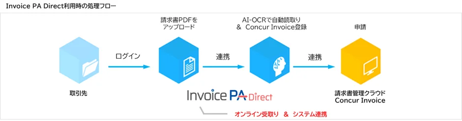 「Invoice PA Direct」は、請求書をオンラインで受け取り、その情報をAI(人工知能)が文字を読み取る技術(AI-OCR)を使って、請求書管理クラウド「Concur® Invoice」へ自動で連携するソリューションです。これにより、請求書を処理する担当者の作業が大幅に減るだけでなく、メールの見落としなどによる支払い処理の遅れを防ぐ効果も期待できます。