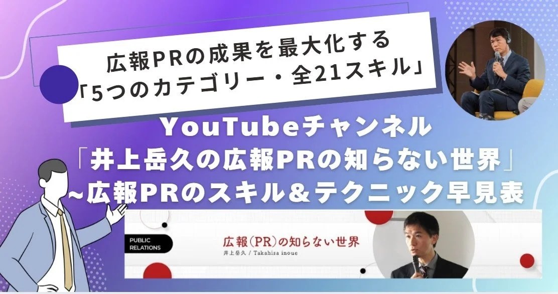 広報PRのコンサルタントとして知られる井上岳久氏が運営するYouTubeチャンネル「井上岳久の広報PRの知らない世界」が、開設から8ヶ月を迎えました。これまでに配信してきた膨大な広報ノウハウを、誰でもわかりやすく学べるように体系化した「広報PRスキル&テクニック早見表(スキル体系化マップ)」が公開されました。
