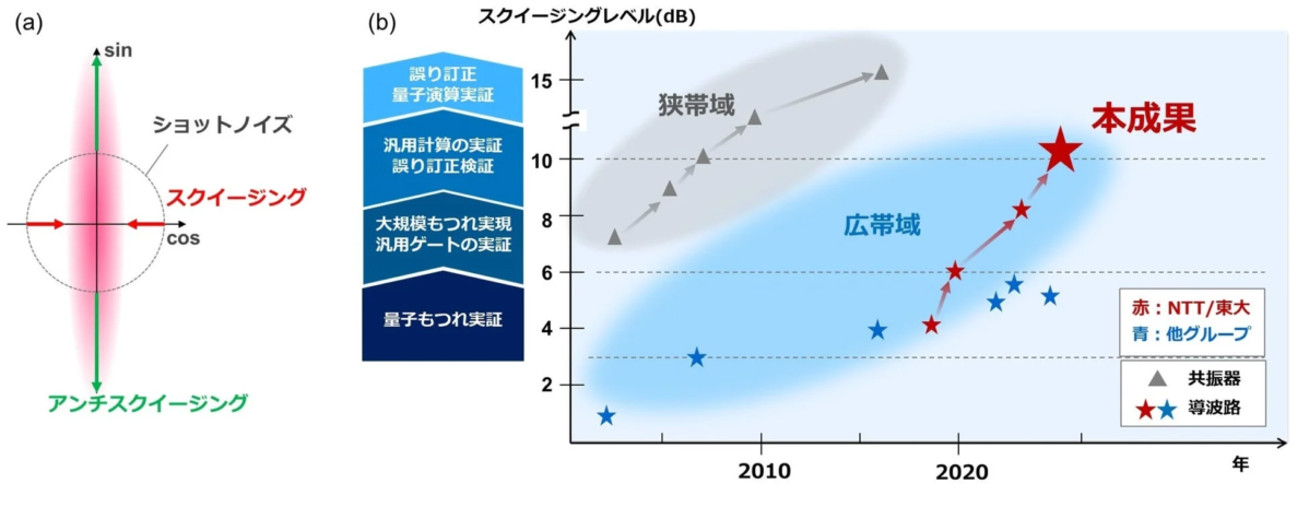 NTT、東京大学、理化学研究所、OptQCの4機関は、導波路型光デバイスを用いたスクイーズド光の生成において、世界最高品質となる10.1 dBの量子ノイズ圧縮に成功しました。この成果は、光量子コンピュータの実現に向けた重要な一歩となります。スクイーズド光は、光量子コンピュータをはじめとするさまざまな光量子技術の基盤となる光です。特に、広帯域で高いレベルの量子ノイズ圧縮がされた高品質なスクイーズド光は、光量子コンピュータを実用化するための最も重要なリソースと言えます。