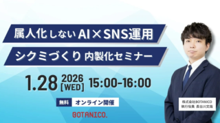 株式会社BOTANICOは、2026年1月28日に「属人化しないAI・SNS運用のシクミづくり内製化セミナー」をオンラインで開催します。AIの活用により、SNS運用が担当者のスキルに依存せず、誰でも成果を出せる「仕組み」を構築する方法を、最新事例とテンプレートを交えて解説。中小企業や個人事業主、マーケティング担当者など、SNS運用に課題を感じている方におすすめです。