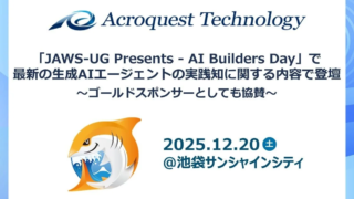 アクロクエストテクノロジー株式会社が、2025年12月20日に開催される「JAWS-UG Presents - AI Builders Day」にゴールドスポンサーとして協賛し、シニアテクニカルアーキテクトの鈴木貴典氏が最新の生成AIエージェント開発に関する実践的な知見を共有します。AI初心者にも分かりやすく、AIエージェントの進化と具体的な活用方法について解説する予定です。